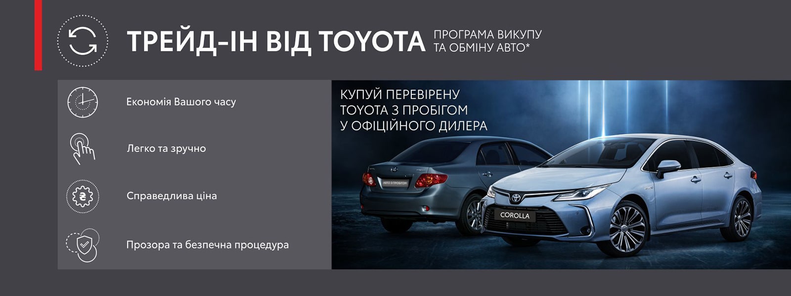 За десятки років виробництва безпечних та надійних автомобілів «Тойота» здобула репутацію виробника особливо якісних транспортних засобів. Ми не перед чим не зупинимося, щоб зберегти цю репутацію незаплямованою.